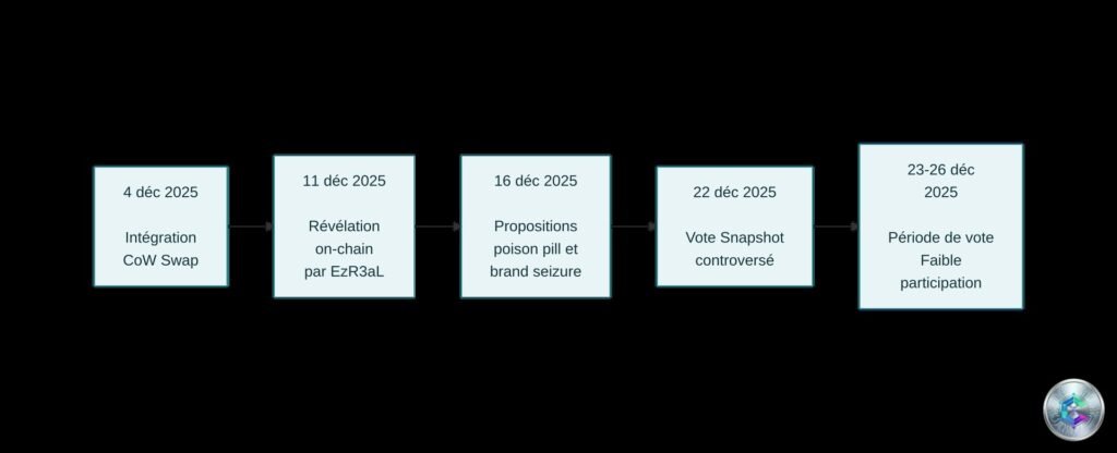 December 22: Aave Labs triggers a Snapshot vote taking up these proposals, in the name of Ernesto Boado. The latter immediately denounces a « forcing through », claiming he never validated this vote. The timing during the Christmas period is seen as an attempt to minimize participation.