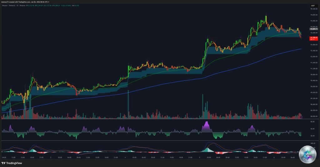 Sur l’unité de temps 15 minutes, l’action des prix se caractérise par une succession de « chasses aux stops » (liquidity runs). On observe fréquemment des mèches rapides vers le bas testant les supports locaux vers 93 000$ – 93 200$, immédiatement suivies par des achats agressifs.