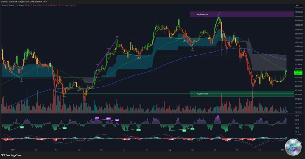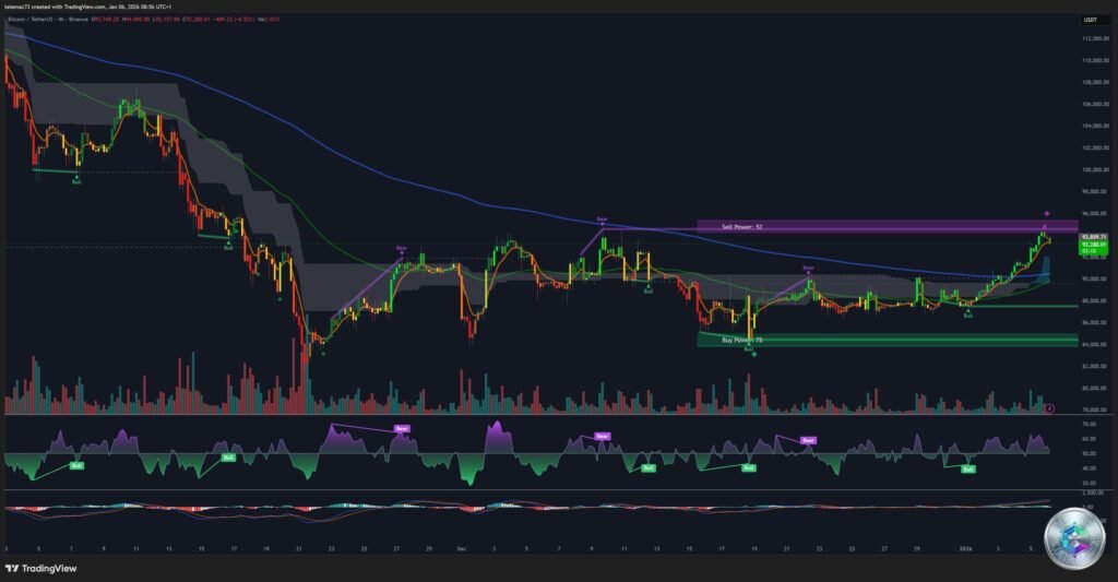 La présence d’un cluster massif de liquidité entre 94 000$ et 97 000$ agit comme un aimant puissant. Le marché semble être dans une phase d’accumulation pré-rupture, soutenue par les flux ETF institutionnels, les fondamentaux énergétiques favorables pour les mineurs, et la saisonnalité positive de janvier.