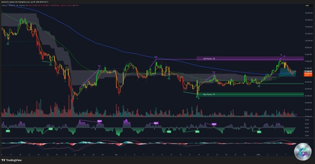Thèse haussière (Bull Flag) : La hausse verticale du début janvier forme le mât, suivie d’une consolidation descendante formant le drapeau. Une cassure de la ligne de tendance supérieure vers 92 500 $ validerait cette figure avec un objectif théorique de 98 000-99 000 $.