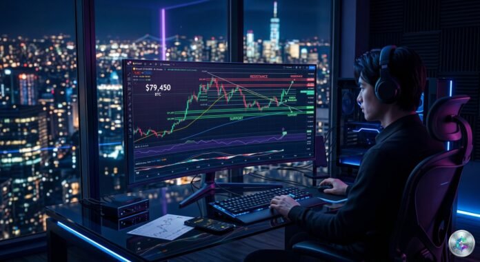 The 15-minute chart exposes the granular attrition war playing out inside larger candles. Bitcoin trades within a nervous ascending micro-channel, with a clear rejection candle visible at the far right — testament to sellers fiercely defending the $79,400 resistance. The EMA 50 (15m) at $77,700 is the first dynamic safety net; the EMA 200 (15m) at $76,900 is the intraday structural foundation. As long as the EMA 50 remains above the EMA 200, the statistical probability of a cascading breakdown remains low.