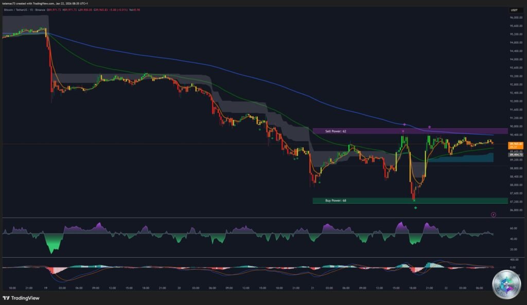 The 4-hour chart offers the clearest evidence of a short-term trend reversal with a market structure break above $94,820. Power indicator analysis shows a marked transition: while previous peaks were accompanied by bearish signals, the recent structure reveals the emergence of bullish signals with « Buy Power » at 71 versus declining « Sell Power » at 59.