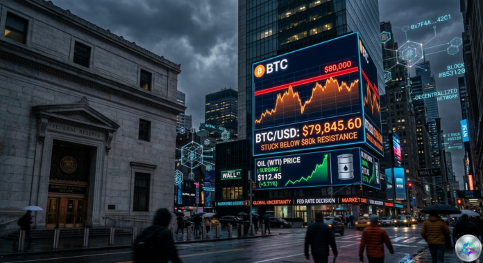 Bitcoin continues to face a major resistance barrier around $80,000, a psychological and technical level the leading cryptocurrency has failed to decisively and sustainably break through for several weeks. The culprit: the US Federal Reserve’s decision to hold interest rates steady, combined with surging energy prices reigniting inflation fears. Fed Chair Jerome Powell warned during his final press conference that this external pressure lies beyond the central bank’s control, leaving crypto investors in prolonged uncertainty. The market appears trapped in a fragile equilibrium between structural growing demand and persistent macroeconomic headwinds that show no sign of abating.