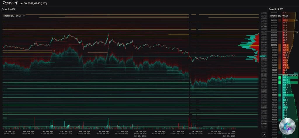 Order book analysis on Binance reveals critical liquidity concentrations. A massive « sell wall » is visible between $90,000 and $92,000, acting as a magnet pushing the price downward. Significant clusters also appear around the psychological level of $100,000.