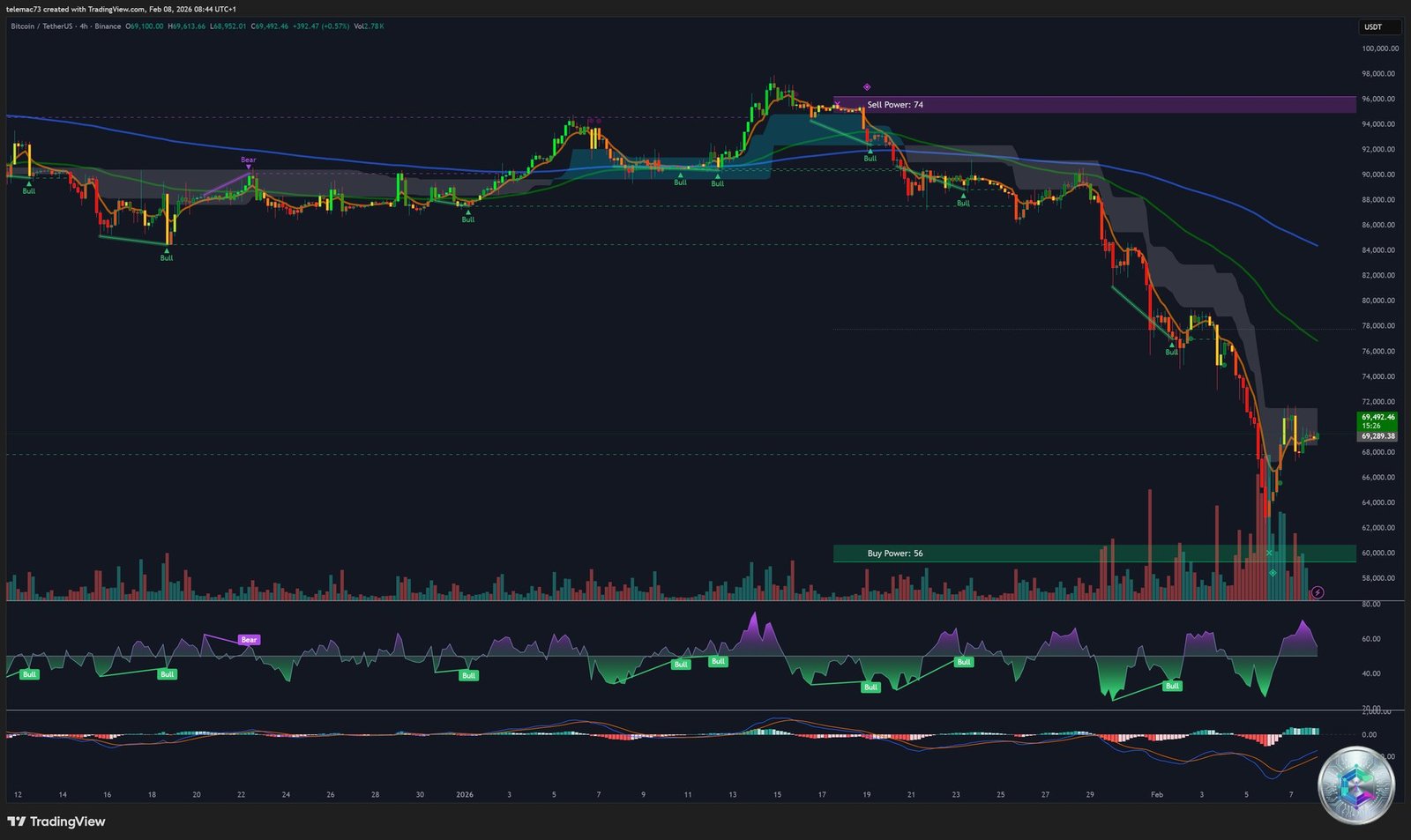 The 4H chart shows an attempt to form a « relief bounce » within a broader bearish trend. Analysts observe a bullish crossover on oversold indicators, with a primary target between $70,000 and $70,500.