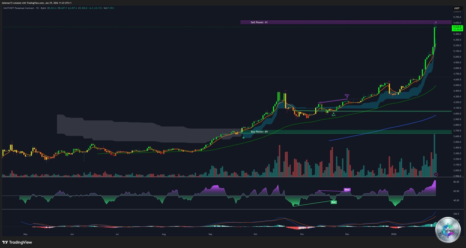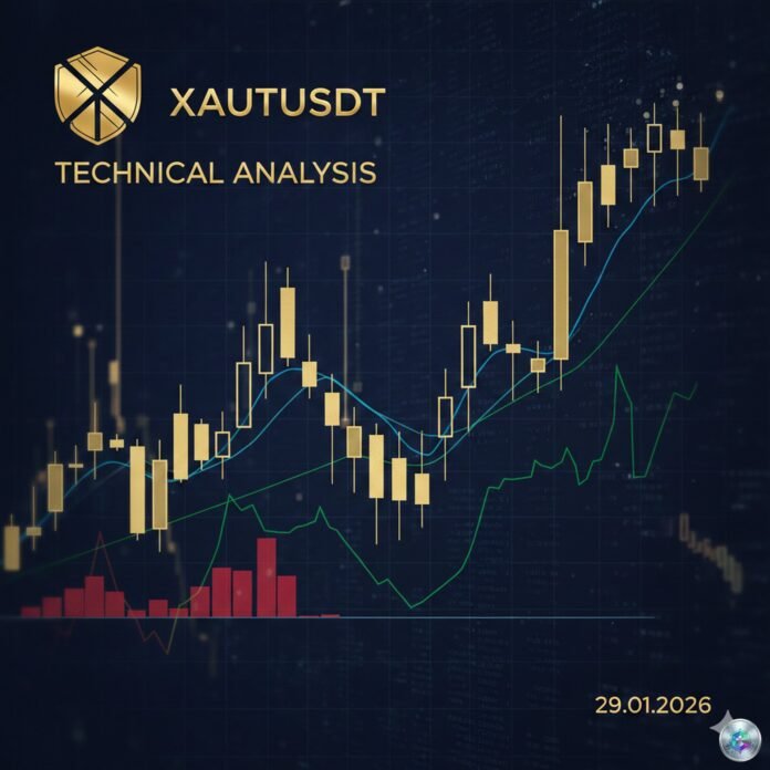 On the daily timeframe, XAUt presents an aggressive uptrend that has broken all historical resistances. The price crossed the psychological level of $5,000 on January 26, triggering a wave of short position liquidations and acceleration toward $5,600.