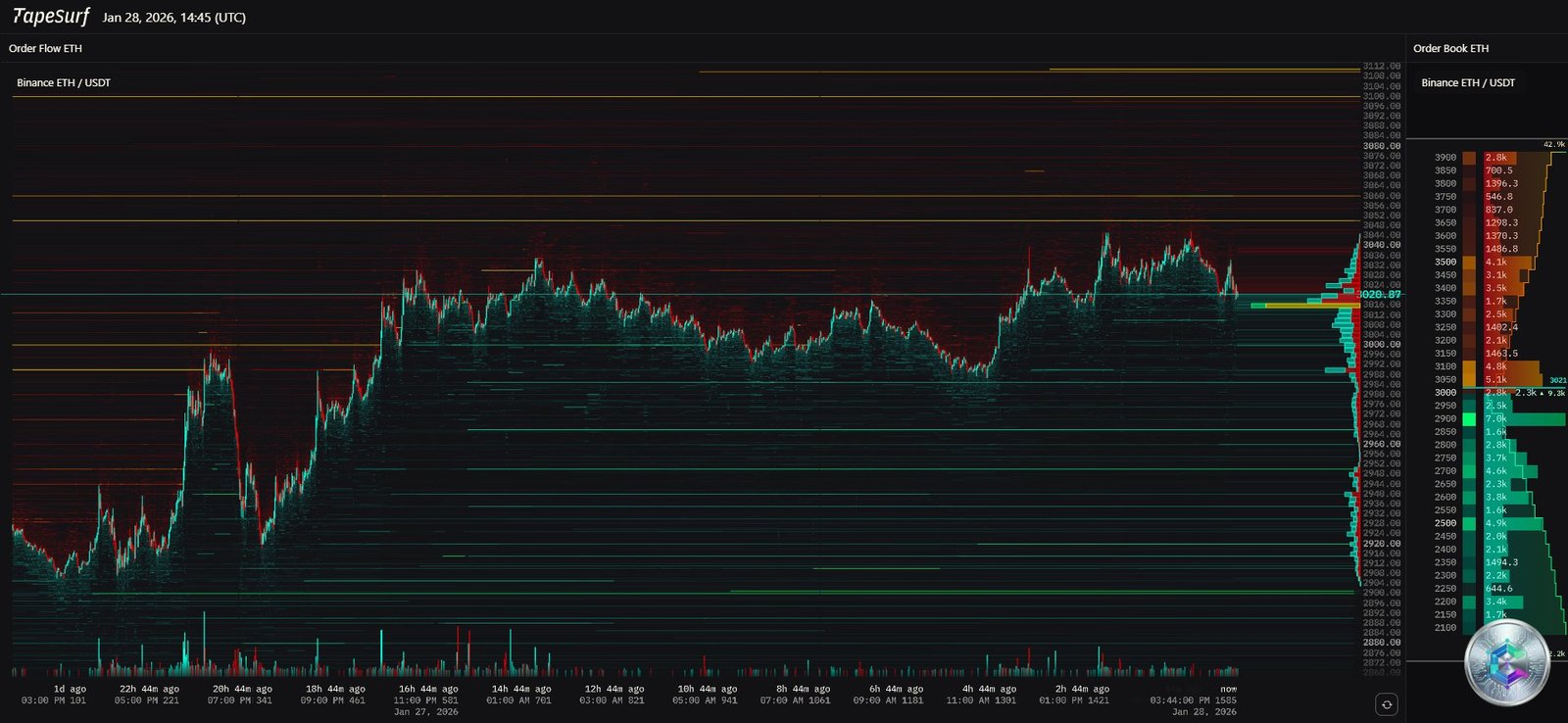 The Binance order book heatmap provides crucial information on institutional positioning. We observe a massive concentration of sell orders starting from $3,050 up to $3,200. These order walls act as physical barriers requiring a powerful external catalyst to be breached.