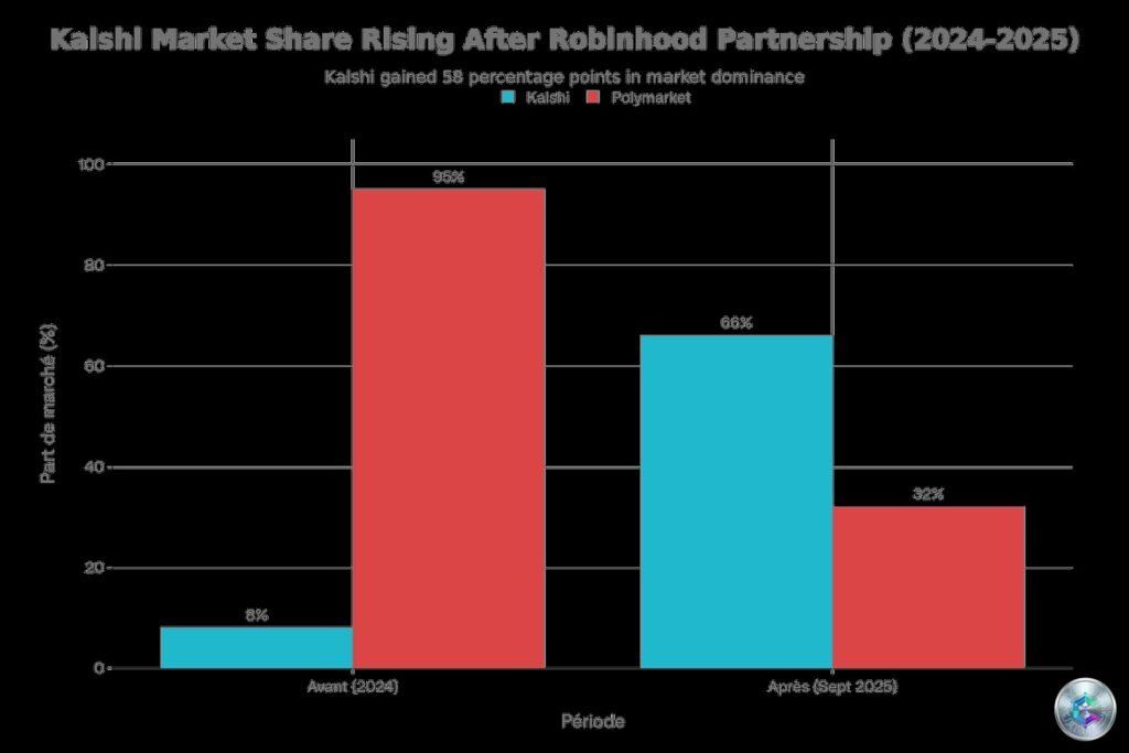 Everything changed with a masterful strategic move: the partnership between Kalshi and Robinhood announced in March 2025. This alliance transformed Kalshi’s regulatory advantage – a federal CFTC license valid in all 50 U.S. states – into a weapon of massive disruption. Within months, positions reversed: Kalshi surged to 66% market share while Polymarket plummeted to 32%.