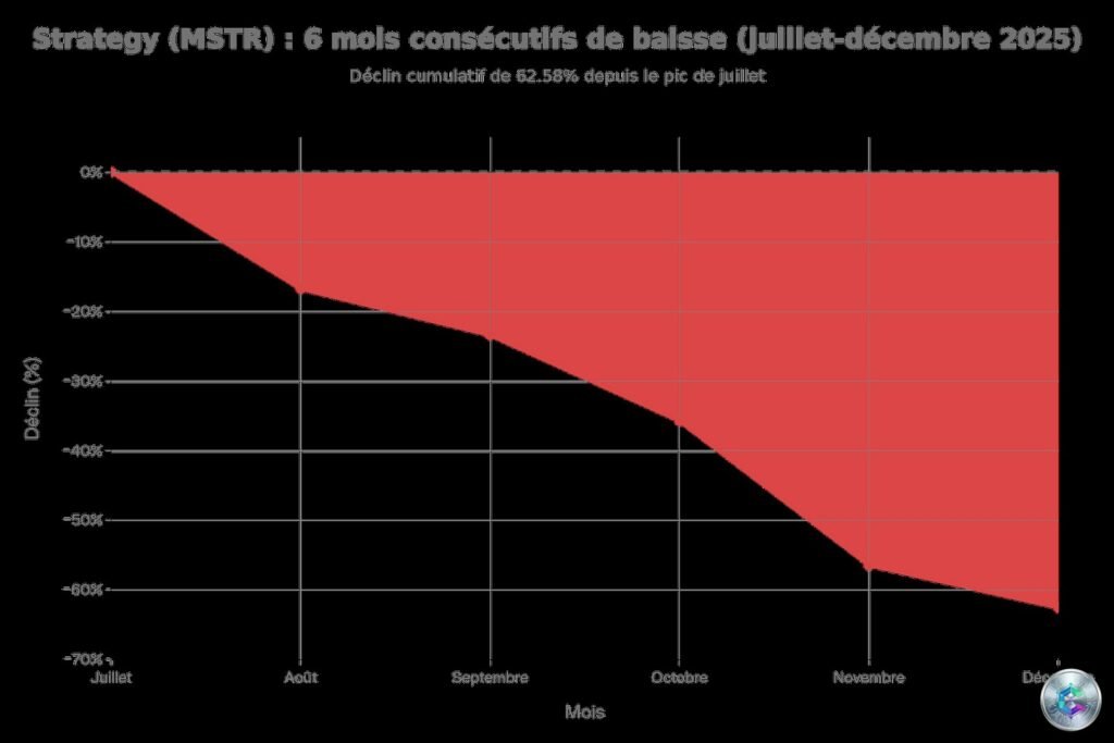 The year 2025 will be etched in Strategy’s (formerly MicroStrategy) stock market history as a major turning point. For the first time since the bold adoption of Bitcoin as a treasury asset in August 2020, the stock of the company led by Michael Saylor has recorded six consecutive months of decline, an unprecedented sequence that disrupts market perception of this now-iconic accumulation model.