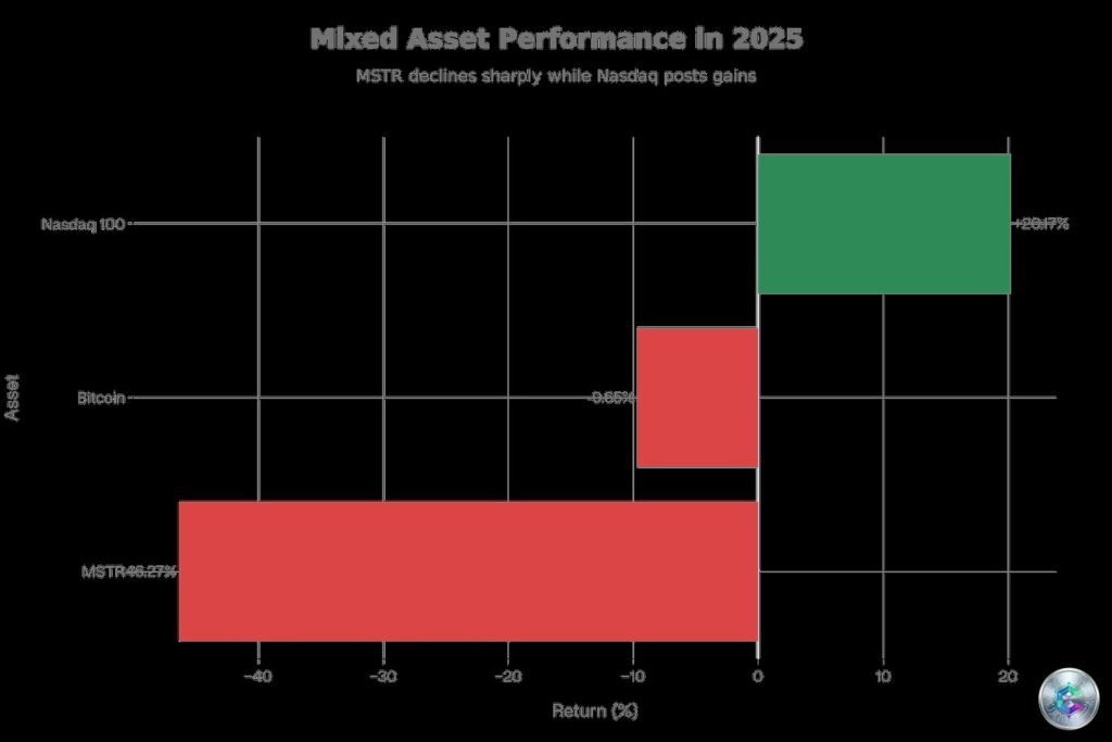 The paradox is striking: while Strategy lost nearly half its value in 2025, Bitcoin limited its annual decline to around -9.65%. Even more surprising, the Nasdaq 100 — the index to which Strategy has belonged since December 2024 — gained more than +20% over the same period.